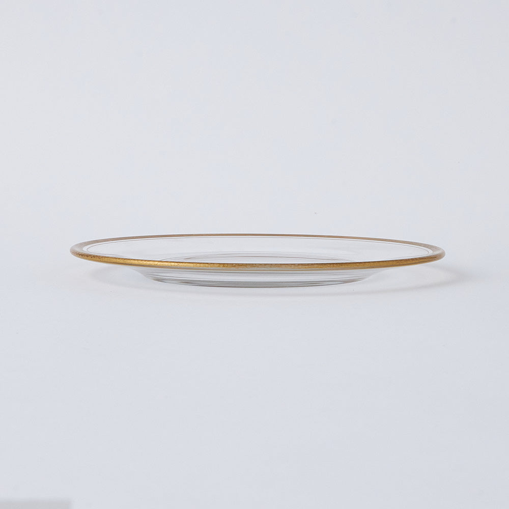 透明度の高いガラスの縁に、上品なゴールドのラインを施した、軽やかでエレガントな丸皿です。