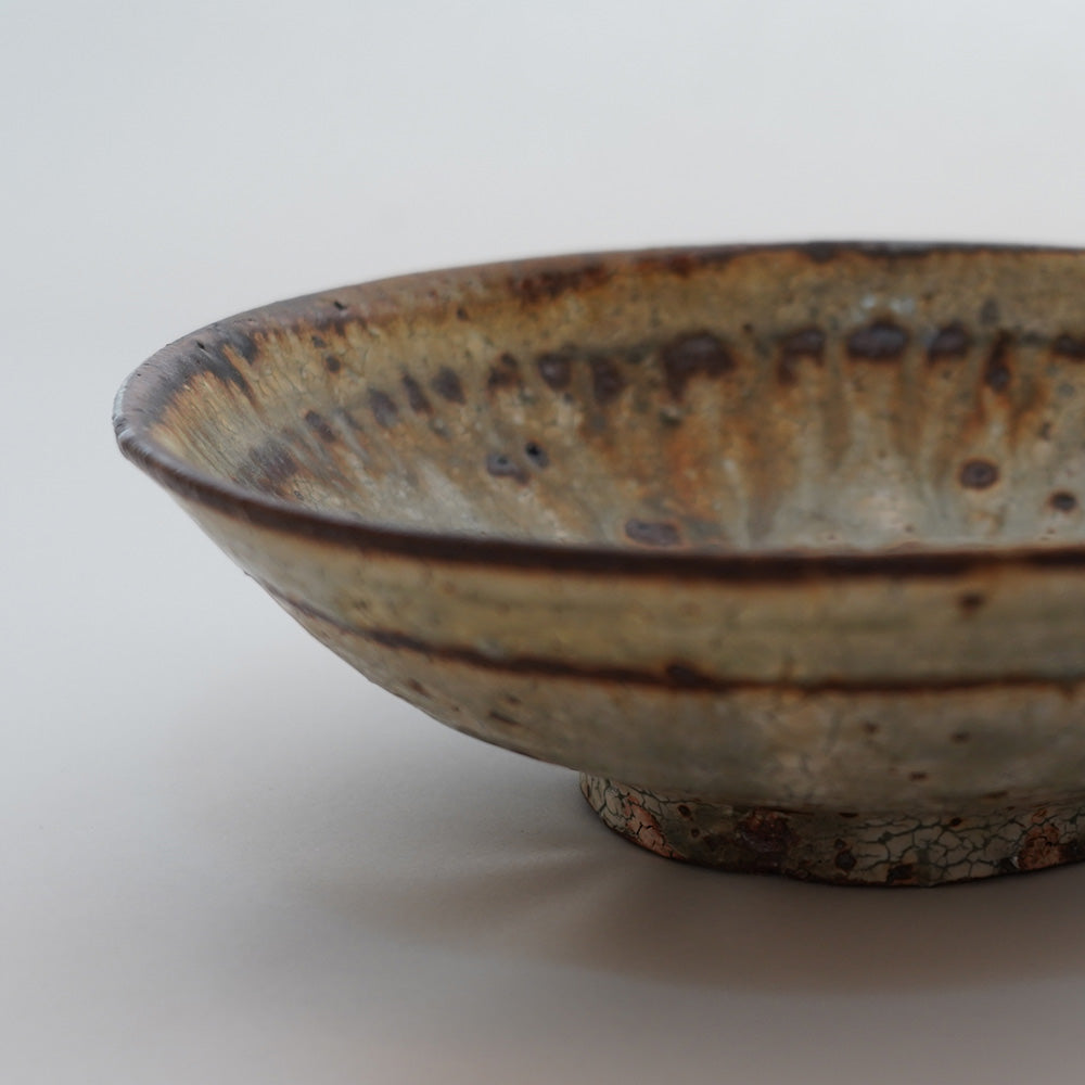 見込み(内側)に溜まった釉薬の複雑な色の重なりが、まるで風景画のような美しさを持つ深皿です。程よい深さと立ち上がりがあるため、盛り付けがしやすく、お料理を立体的に見せてくれます。