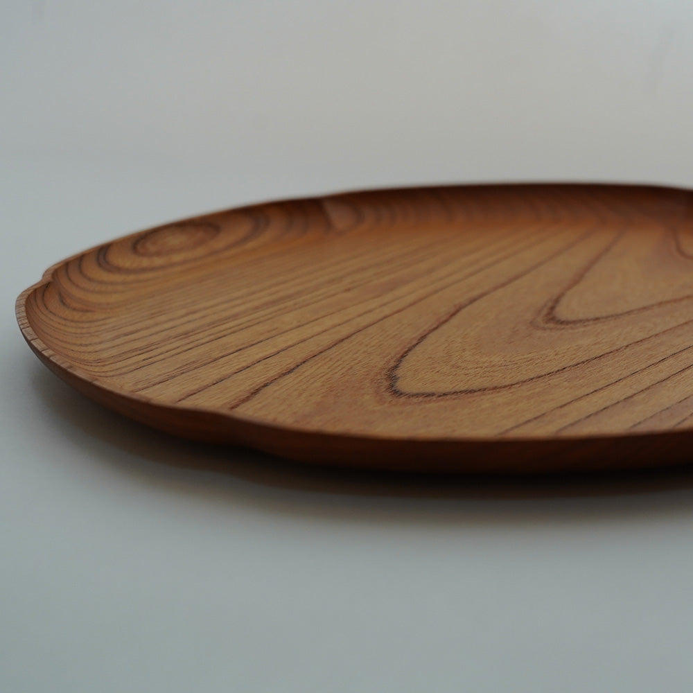 花びらを模したような縁の曲線が美しい、上質な木製のお盆です。天然木の豊かな表情を活かしたシンプルなデザインは、和洋どちらのスタイルにも不思議と馴染みます。