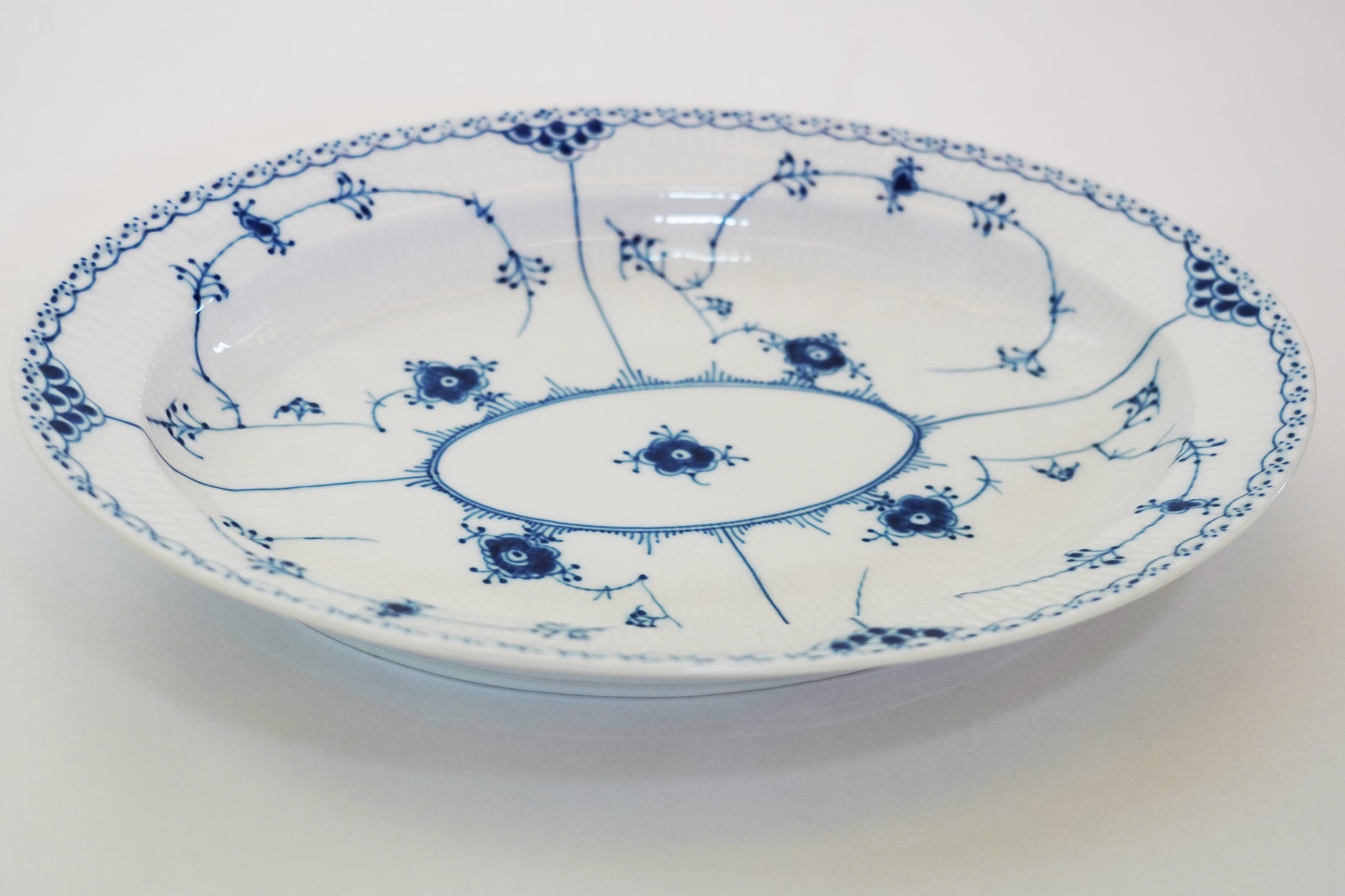 美しい地模様(フルーティング)に、繊細な手描きのブルーモチーフと、縁に施されたエレガントなレースの透かし彫りが完璧な調和を見せます。
